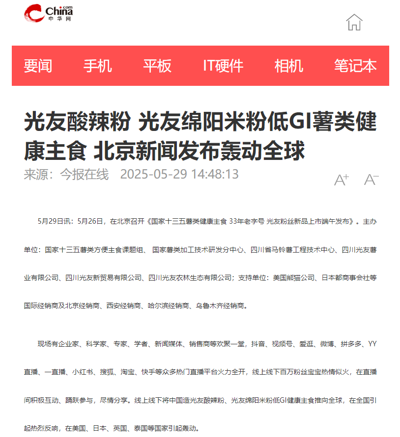 轉(zhuǎn)載中華網(wǎng)——光友酸辣粉 光友綿陽米粉低GI薯類健康主食 北京新聞發(fā)布轟動(dòng)全球